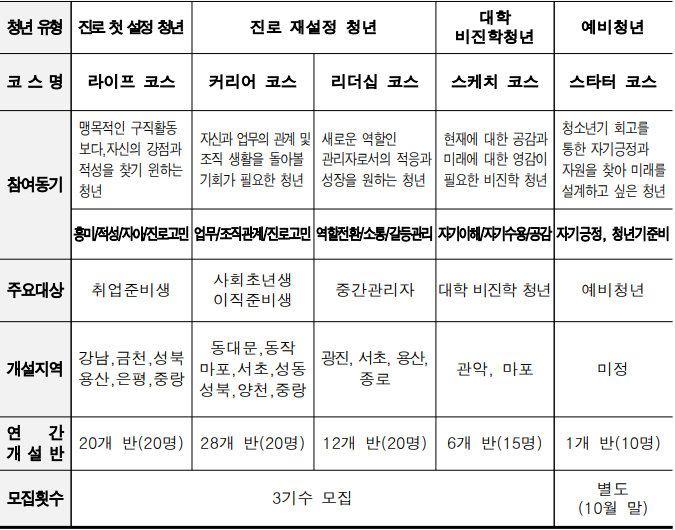 | ▸ 라이프 코스 : 삶과 일을 대하는 자기만의 방식을 찾을 수 있는 코스 ▸ 커리어 코스 : 업무환경, 인간관계 등 조직을 고려한 자기 이해 과정 ▸ 리더십 코스 : 팀을 이끌게 된 청년들의 소통 역량 강화를 위한 코스 ▸ 스케치 코스 : 경험에서 인생 자원을 찾는 대학 비진학 청년 대상 특화 코스 ▸ 스타터 코스 : 청소년기를 토대로 2030 청년기를 설계하는 예비청년 특화 코스 |